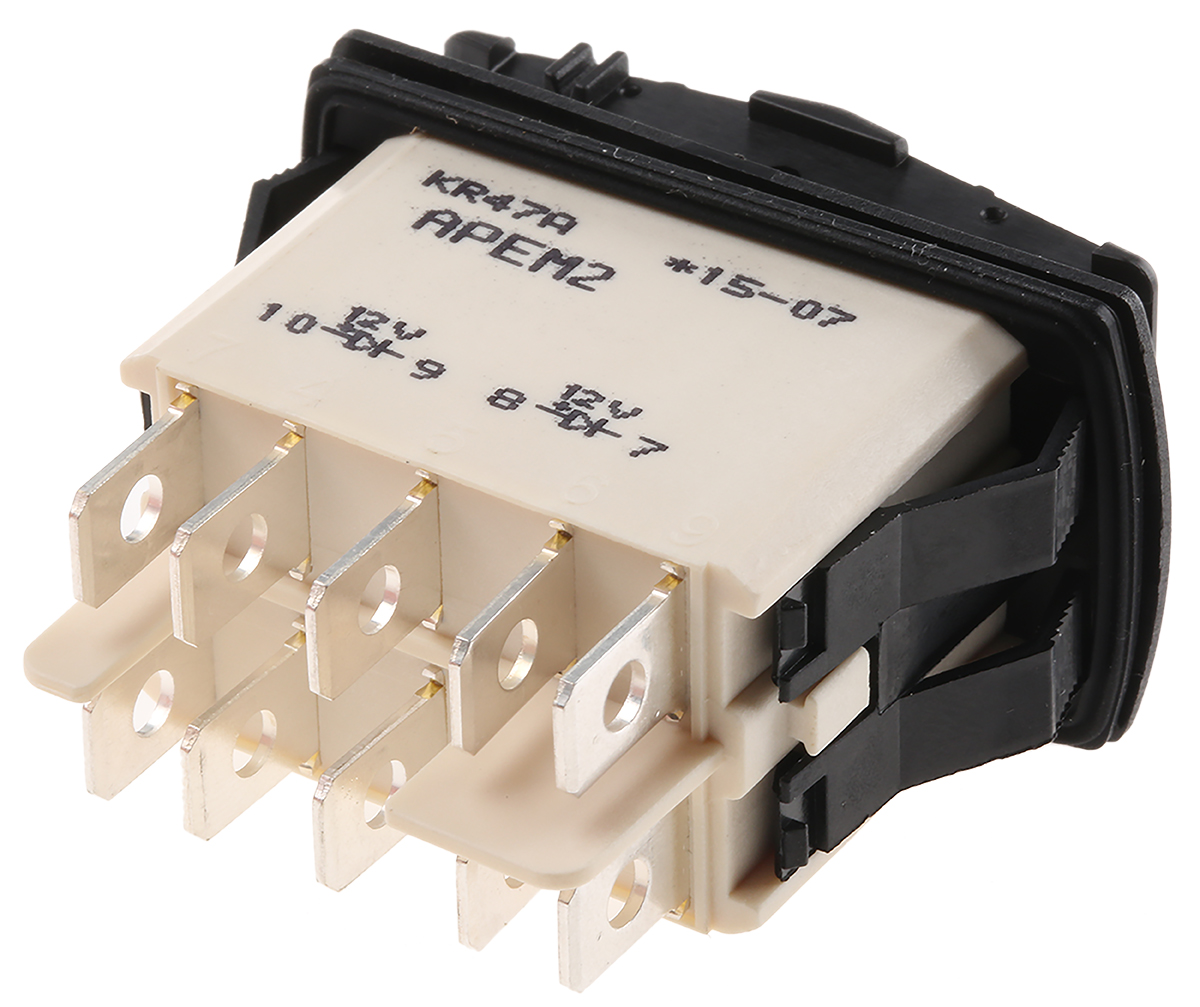 This is Apem Illuminated DPDT (On)-Off-(On) Rocker Switch Panel manufactured by APEM. The manufacturer part number is KR47CAKEEG. The product is available in panel mount configuration. Whereas, the minimum operating temperature of the product is -40°c. It features a 10mω contact resistance. The product also provide mechanical stability with 150000operations. It has a maximum operating temperature of +85°c. The terminal is a quick connect, solder type. The product is made from sturdy silver materials.