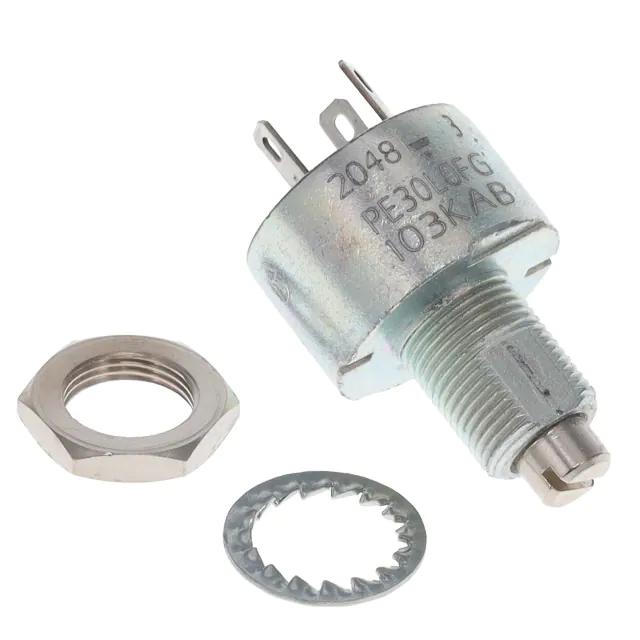 This is manufactured by Vishay Sfernice. The manufacturer part number is PE30L0FG103KAB. It is assigned with possible HTSUS value of 8533.40.8050. The product is rohs3 compliant. Moreover, it has solder lug terminal style. It exhibits an excellent temperature coefficient of ±150ppm/°c. The product features power and watts of 3w. It has adjustment flexibility and is adjusted at a user defined. Built in Switch Info: none. Moreover, the given resistance of the product is 10k. The actuator is a 0.630" (16.00mm) long. It features ±10% of tolerance value. It is shipped in box. Consist of 1 turns. The product is equipped with a cermet resistive material. Allows 300° rotation. It features a linear taper. Its typical moisture sensitivity level is not applicable. The actuator has a 0.236" (6.00mm) diameter. It has a long 14 weeks standard lead time. Has a body size of round - 0.776" dia (19.70mm). The product is available in panel mount configuration. The product pe30, is a highly preferred choice for users. It comprises 1 gangs. The product has bushing thread of m10 x 0.75. The product carries slotted actuator. The product is designated with the ear99 code number