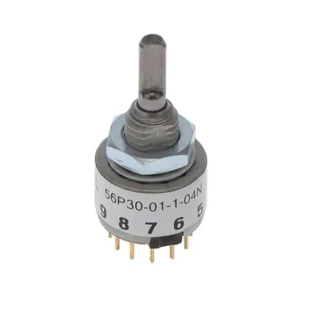 This is manufactured by Grayhill Inc.. The manufacturer part number is 56P30-01-1-04N. It is assigned with possible HTSUS value of 8536.50.9025. The product is rohs3 compliant. Moreover, it has pc pin terminal style. 30 v of DC voltage rating. The product carries possible position value of 4. The actuator is a 9.53mm long. The product's number of decks equals 1. The product exhibits 115 v of AC voltage rating. In addition, it is reach unaffected. Typical depth of 9.58mm behind panel. Features fixed index stops. Whereas, there are 1 poles per deck. It is shipped in bulk. It has a throw angle 30°. Furthermore, the product is galvanized with excellent silver contact finishing. Its typical moisture sensitivity level is 1 (unlimited). It has a long 15 weeks standard lead time. Additionally, the product's output is 200ma (ac/dc) Contact Timing Options: non-shorting (bbm). The product is available in panel mount, through hole configuration. The product 56, is a highly preferred choice for users. The product is designated with the ear99 code number The product carries flatted (3.17mm dia) actuator. Features sp4t circuit per deck. Moreover, it corresponds to 56p30, a base product number of the product. The product is made from sturdy brass materials.