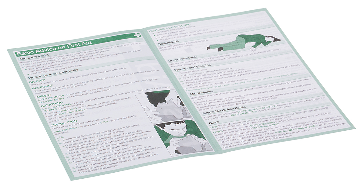 This is First Aid Guidance Safety Pocket guide Paper English 100 mm 50mm manufactured by RS Pro. The manufacturer part number is 787-3751. The product is made from highly stable and reliable paper. In addition, the height is 100 mm. Furthermore, the product is 50mm wide. It comes in leaflet configuration.