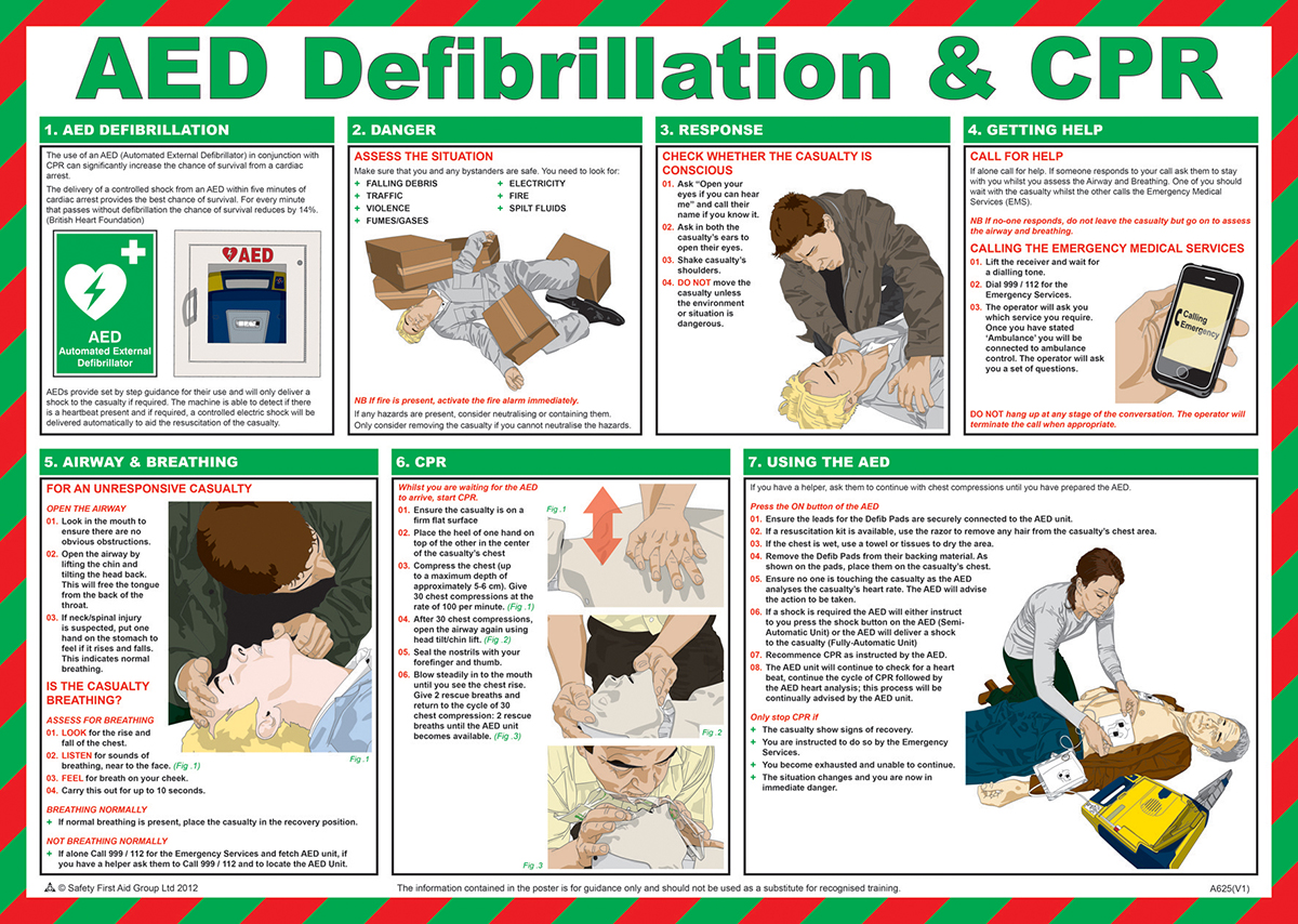 This is AED Defibrillation and CPR Safety Poster Semi Rigid Laminate English 420 mm 590mm manufactured by RS Pro. The manufacturer part number is 901-1361. The product is made from highly stable and reliable semi rigid laminate. In addition, the height is 420 mm. Furthermore, the product is 590mm wide. It comes in poster configuration.