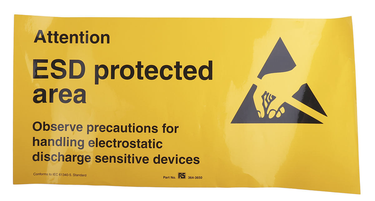This is Black/Yellow Vinyl ESD Poster Attention Esd Protected Area 300 mm x 600mm manufactured by RS Pro. The manufacturer part number is 364-3650. The product is made from highly stable and reliable vinyl. In addition, the height is 300 mm. Furthermore, the product is 600mm wide.