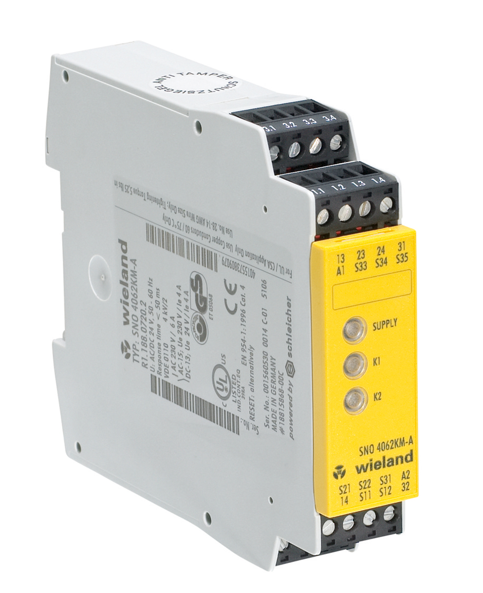 This is SNO 4062KM 24 V ac/dc Safety Relay Dual Channel with 2 Safety Contacts and 1 Auxilary Contact manufactured by Wieland. The manufacturer part number is R1.188.0720.2. It performs basic function of emergency stop, light beam/curtain, safety switch/interlock. The product sno 4062km, is a highly preferred choice for users. Its accurate length is 22.5mm. Furthermore, the product is 114mm wide. The product comes in 96.5mm depth. It is supplied with 2 channels. The terminal is a screw type.