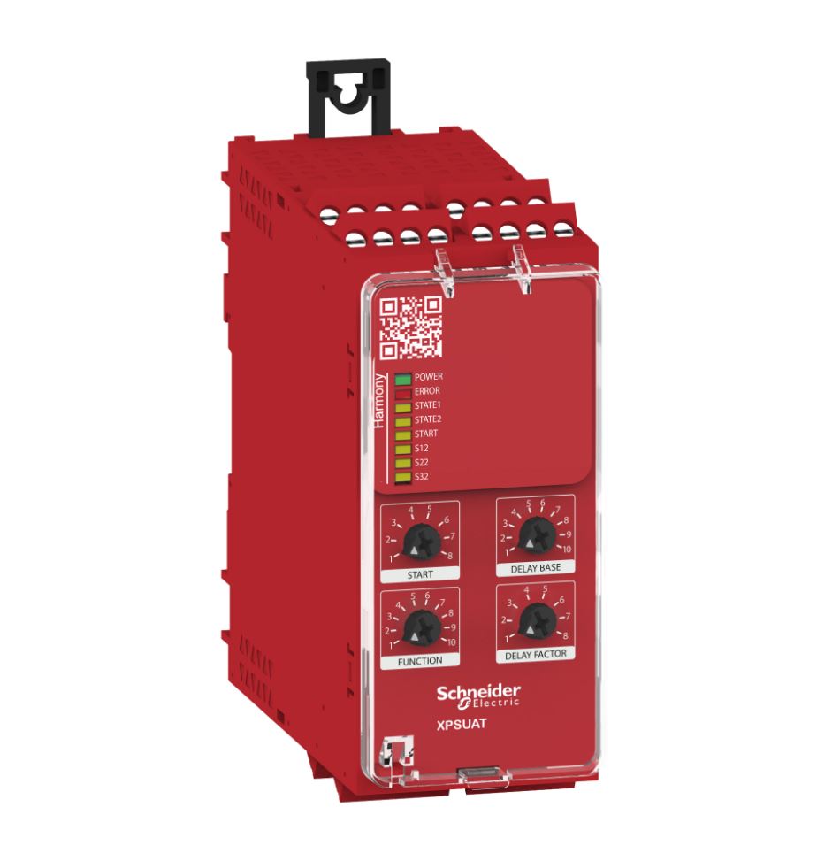 This is 24 V Safety Relay 3 Channels With 7 Safety Contacts manufactured by Schneider Electric. The manufacturer part number is XPSUAT13A3AP. It performs basic function of emergency stop. Its accurate length is 100mm. Furthermore, the product is 45mm wide. The product comes in 120mm depth. It is supplied with 3 channels. The terminal is a screw type.