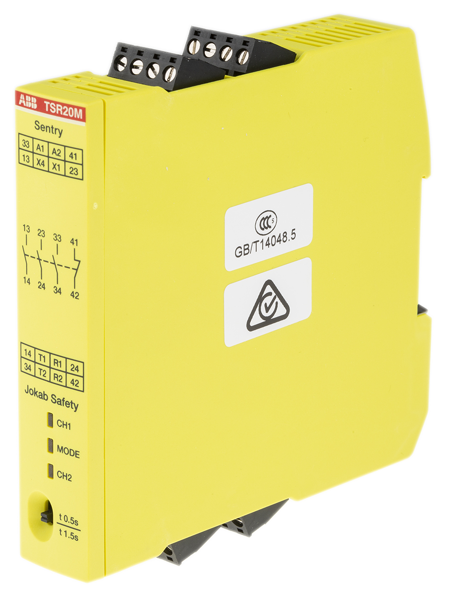 This is Sentry 265 V ac 375 V dc Safety Relay - Dual Channel With 4 Safety Contacts 3NO/NC Auxiliary Contact manufactured by ABB Jokab. The manufacturer part number is 2TLA010061R0100 Sentry TSR20M VAC/VDC. It performs basic function of safety switch. The product tsr20m, is a highly preferred choice for users. Its accurate length is 22.5mm. Furthermore, the product is 120mm wide. The product comes in 120mm depth. It is supplied with 2 channels. The terminal is a screw type.