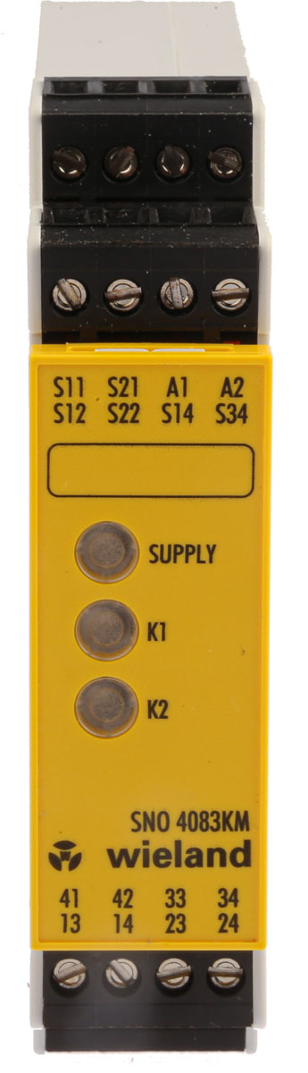 This is Dual Channel 24V dc Safety Relay 3 Safety Contacts Safety Category 4 manufactured by Wieland. The manufacturer part number is R1.188.3580.0. The product sno 4083, is a highly preferred choice for users. Its accurate length is 96.5mm. Furthermore, the product is 22.5mm wide. The product comes in 114mm depth. It is supplied with 2 channels. The terminal is a screw type.
