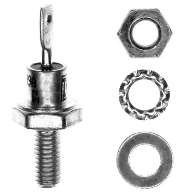 This is Rectifier diode 16FR120M 16A 1200V manufactured by Vishay. The manufacturer part number is VS-16FR120M. The product is available in thread mount configuration. It is designed with a rectifier diode. The diode features a stud anode configuration.