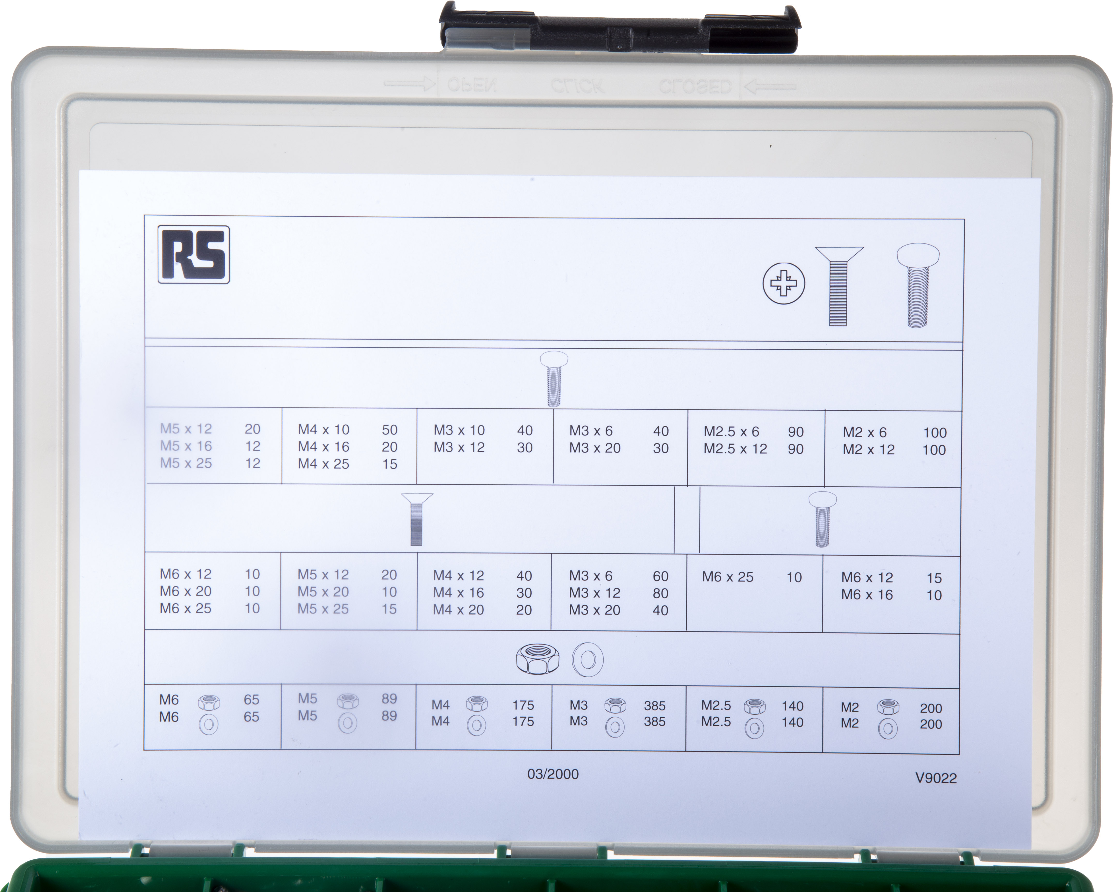 This is 3168 piece Stainless Steel Screw/Bolt Kit M2 M2.5 M3 M4 M5 M6 manufactured by RS Pro. The manufacturer part number is 281-984. A quality product with a nice plain finish. The product features a pozidriv drive. The product is made from highly stable and reliable stainless steel. It has a typical thread size of m2, m2.5, m3, m4, m5, m6.