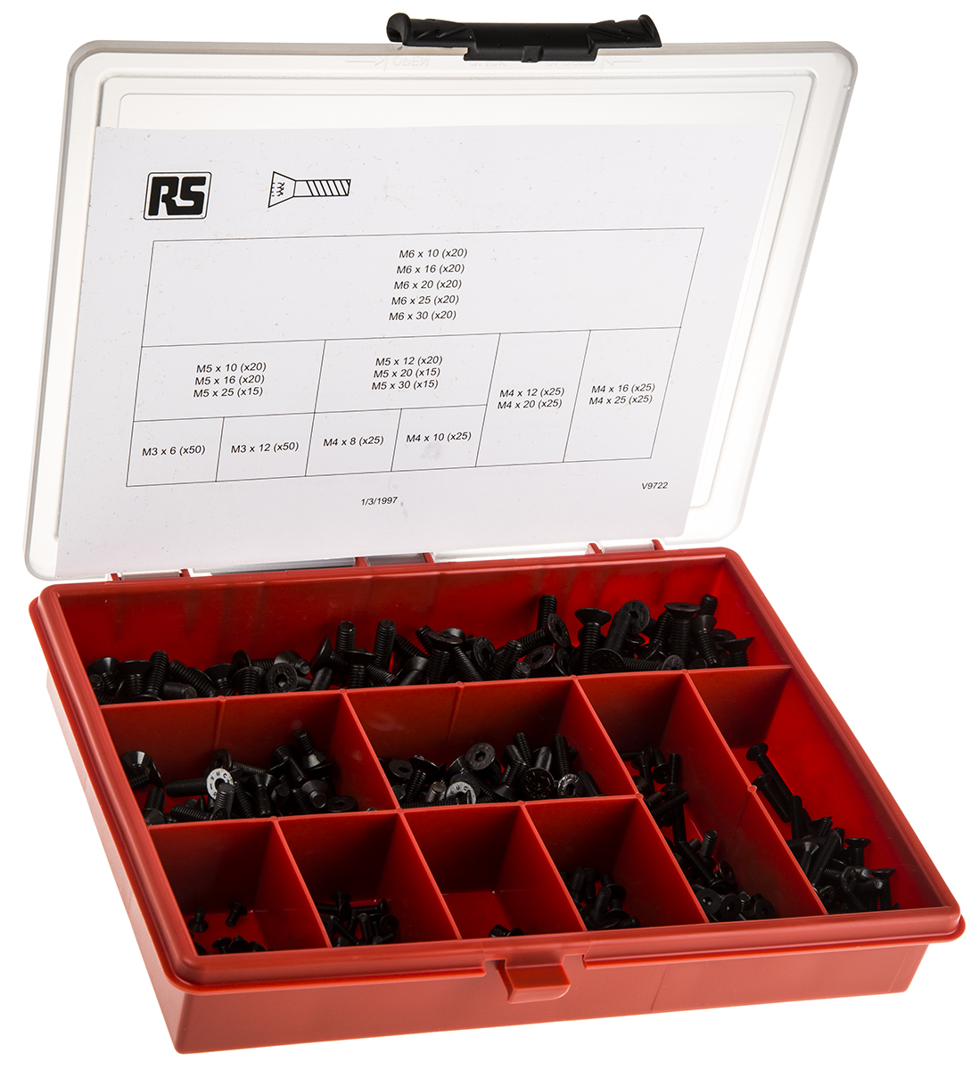 This is 455 piece Steel Screw/Bolt Kit M3 M4 M5 M6 manufactured by RS Pro. The manufacturer part number is 823-897. A quality product with a nice black oxide finish. The product features a hex socket drive. The product is made from highly stable and reliable steel. It has a typical thread size of m3, m4, m5, m6.