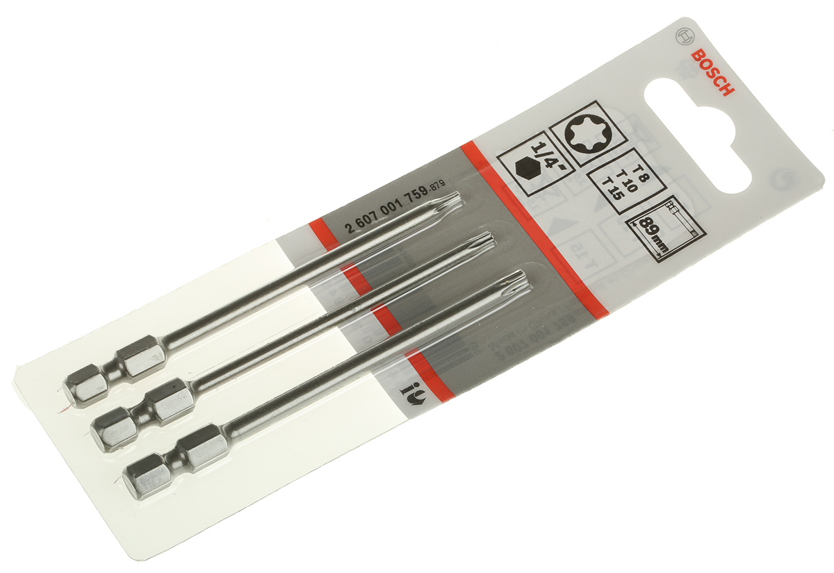 This is 3 pieces Driver Bit Torx Driver Bit T10 T15 T8 manufactured by Bosch. The manufacturer part number is 2607001759. It comes in driver bit configuration. The product is available in t8, t10, t15 size.