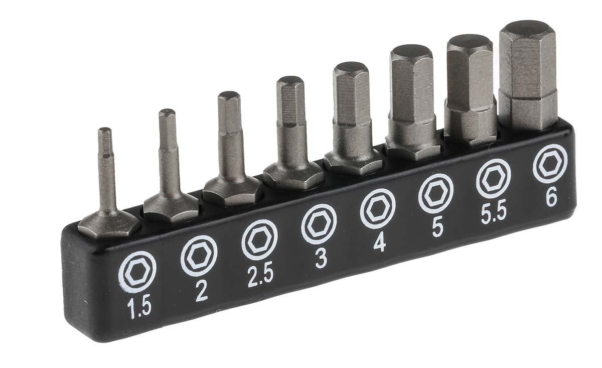 This is 8 pieces Alloy Steel Driver Bit Hexagon Bit 1.5 → 6 x 25 mm manufactured by RS Pro. The manufacturer part number is 615-9221. The product is made from highly stable and reliable chrome molybdenum vanadium steel. It comes in driver bit configuration. The product is available in hex 1.5, hex 2, hex 2.5, hex 3, hex 4, hex 5, hex 5.5, hex 6 size.