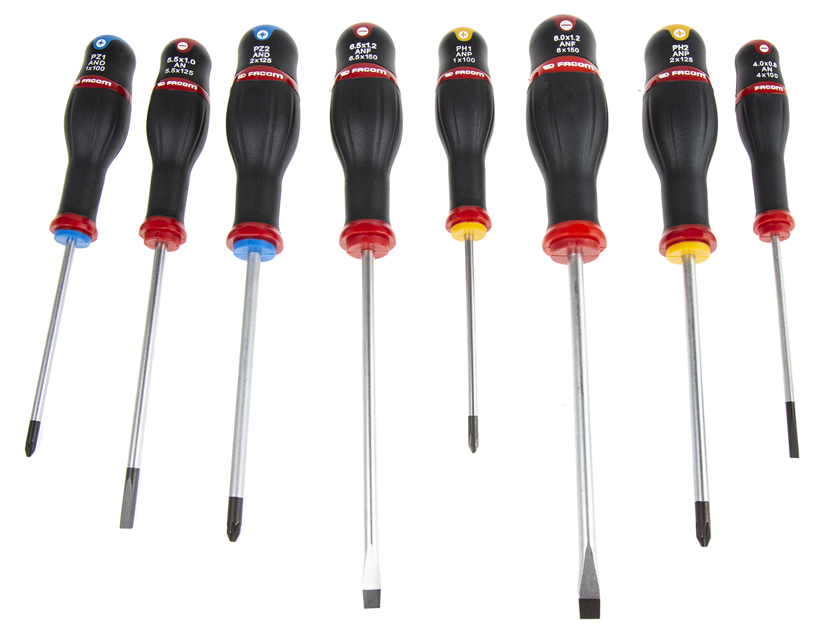 This is 8 pieces Engineers Slotted; Phillips; Pozidriv Screwdriver Set manufactured by Facom. The manufacturer part number is AN.J8. The built-in exquisite tip is a slotted' phillips' pozidriv tip.