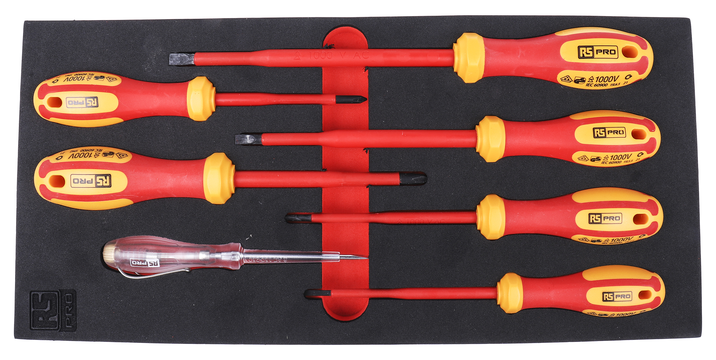 This is 7 pieces Insulated Phillips Slotted Screwdriver Set manufactured by RS Pro. The manufacturer part number is 833-5941. The built-in exquisite tip is a phillips, slotted tip.