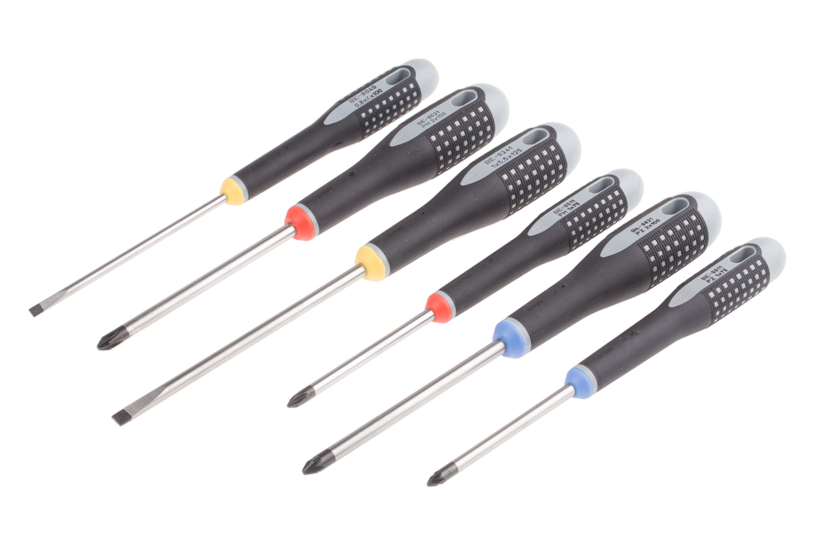 This is 6 pieces Insulated Phillips Pozidriv Slotted Screwdriver Set manufactured by Bahco. The manufacturer part number is BE-9884. The built-in exquisite tip is a phillips, pozidriv, slotted tip.