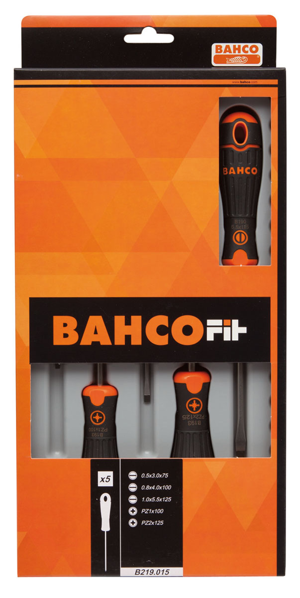 This is Screwdriver Set 5 Piece - Standard Pozidriv Slotted manufactured by Bahco. The manufacturer part number is B219.015. The built-in exquisite tip is a pozidriv, slotted tip.