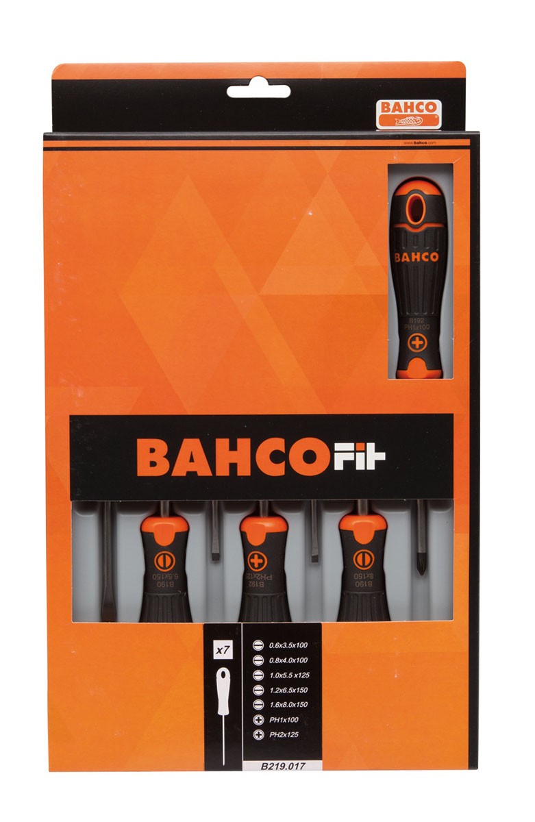 This is Screwdriver Set 7 Piece - Standard Phillips Slotted manufactured by Bahco. The manufacturer part number is B219.017. The built-in exquisite tip is a phillips, slotted tip.