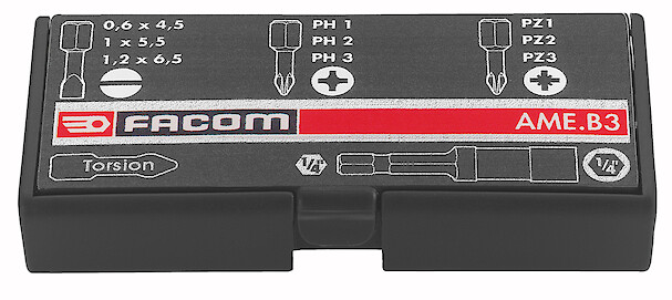 This is Phillips Pozidriv Slotted Screwdriver Set 9 Piece manufactured by Facom. The manufacturer part number is AME.B3. The built-in exquisite tip is a phillips, pozidriv, slotted tip.