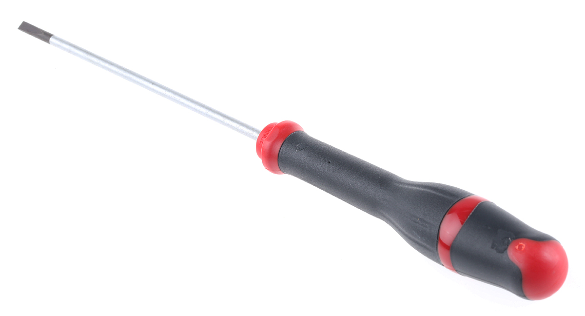 This is 100 mm Silicon Carbon Steel Ergonomic Screwdriver Slotted 0.5 mm Tip Polyurethane; Polyamide manufactured by Facom. The manufacturer part number is AN3X100. The built-in exquisite tip is a flat tip.