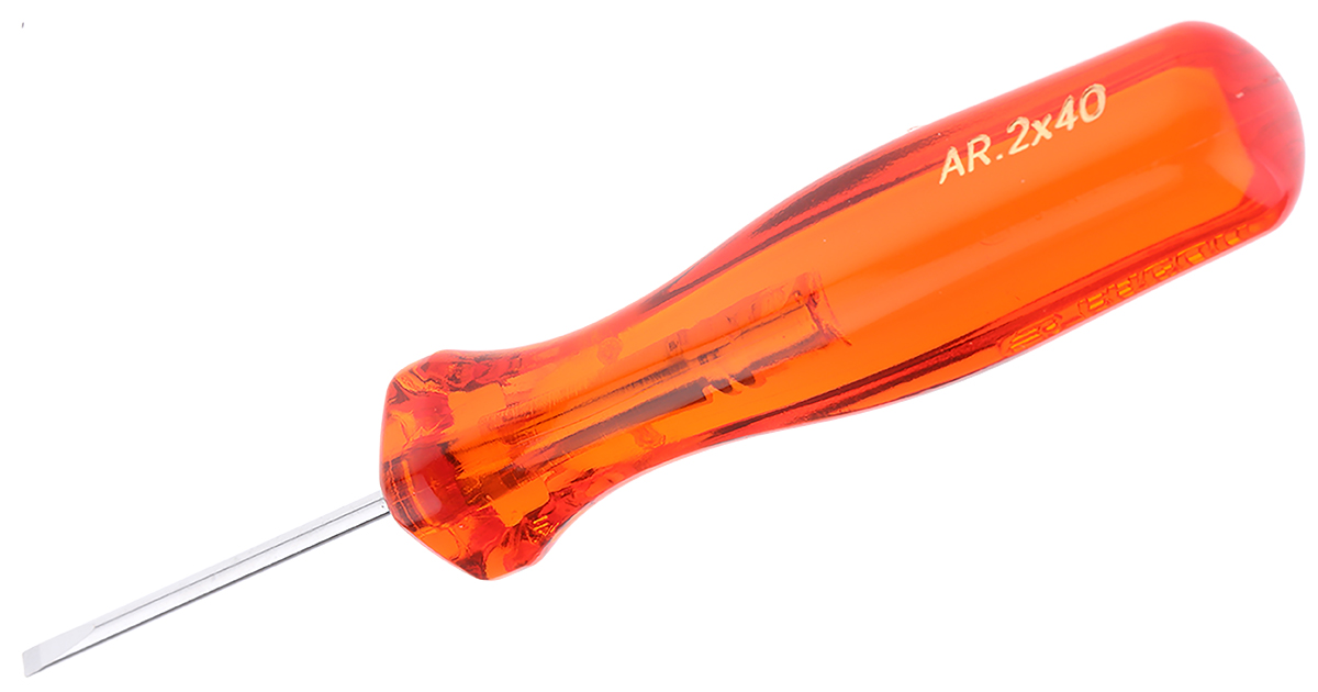 This is 40 mm ISORYL Screwdriver Slotted 0.4 x 2 mm Tip manufactured by Facom. The manufacturer part number is AR.2X40. The built-in exquisite tip is a flat tip.