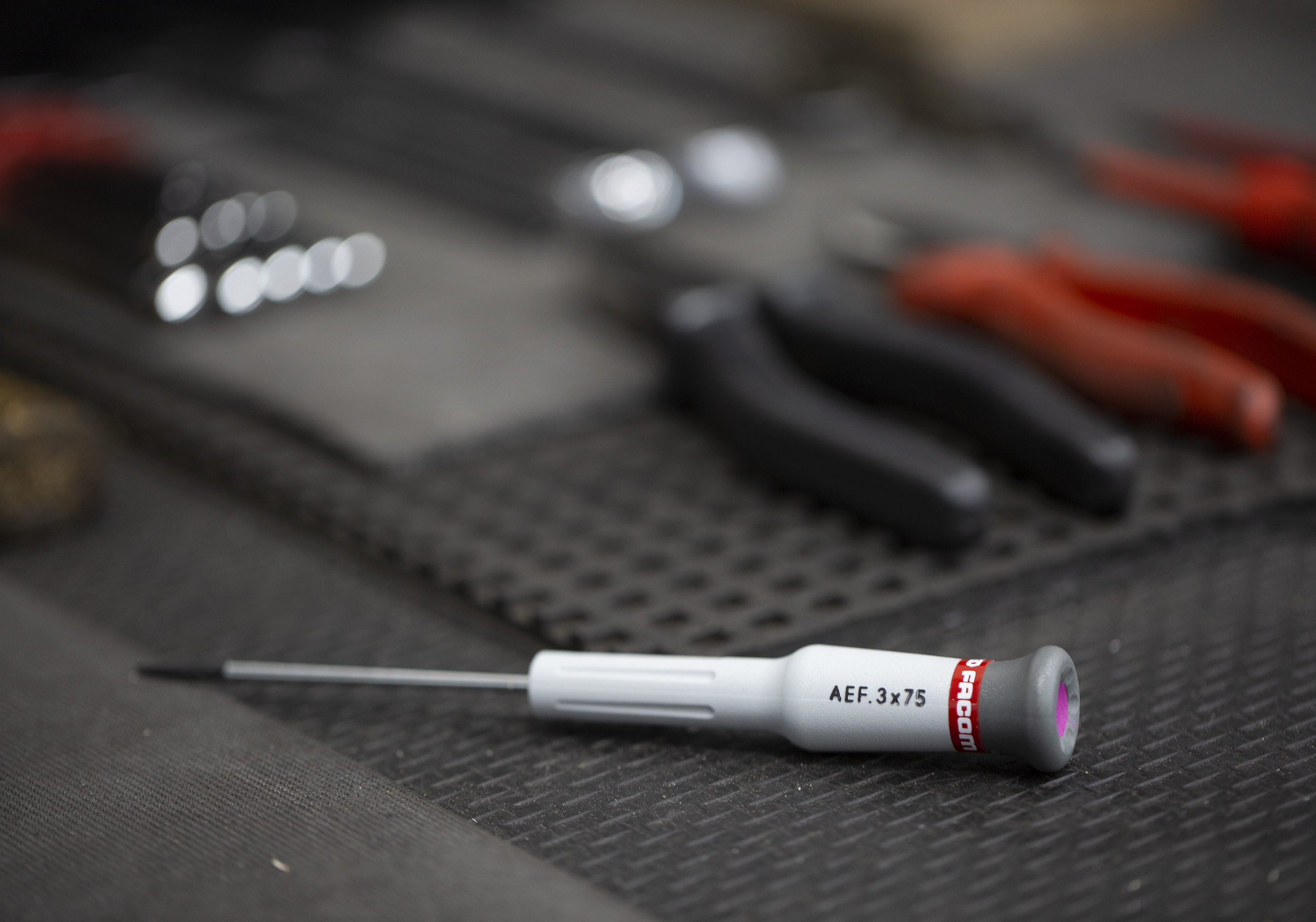 This is 75 mm Electronics Screwdriver Slotted 3 mm Tip Bi-material manufactured by Facom. The manufacturer part number is AEF.3X75. The built-in exquisite tip is a flat tip.