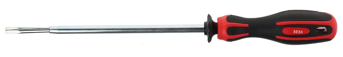 This is 200 mm Gripping Driver Screwdriver Slotted 0.9 mm Tip Plastic manufactured by RS Pro. The manufacturer part number is 547-981. The built-in exquisite tip is a flat tip.
