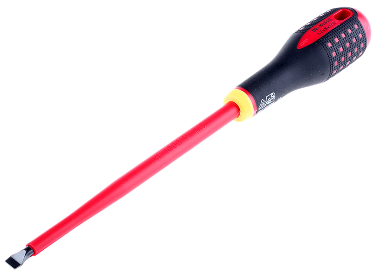 This is 175 mm Alloy Steel 1000V Screwdriver Slotted 1.2 x 8 mm Tip Bi-material manufactured by Bahco. The manufacturer part number is BE-8065S. The built-in exquisite tip is a flat tip.