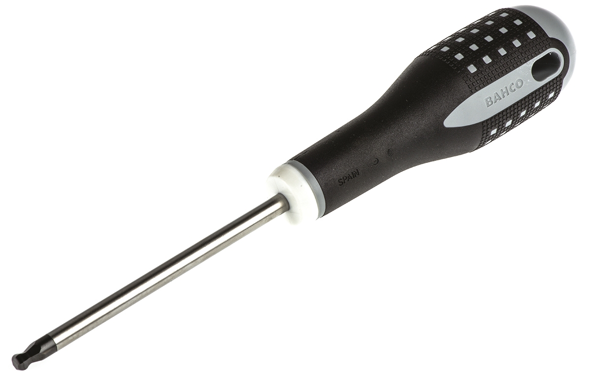 This is 100 mm Alloy Steel Ergonomic Screwdriver Hexagonal Ball End 5 mm Tip Bi-material manufactured by Bahco. The manufacturer part number is BE-8705. The built-in exquisite tip is a hexagon tip.