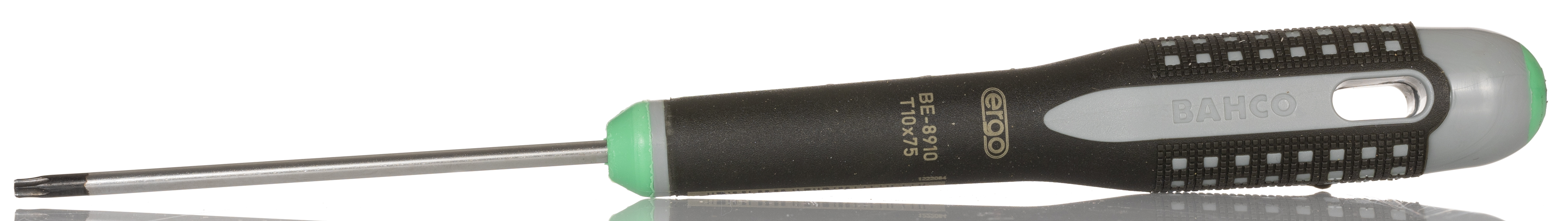This is 75 mm Alloy Steel Ergonomic Screwdriver Torx T10 Tip Bi-material manufactured by Bahco. The manufacturer part number is BE-8910. The built-in exquisite tip is a torx tip.