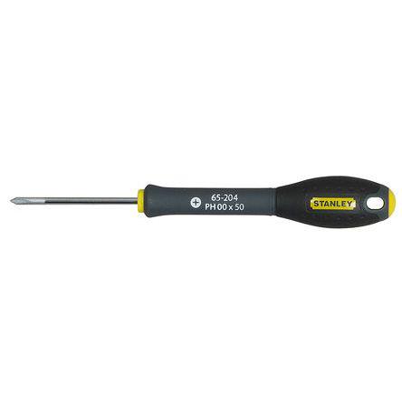 This is 50 mm Steel Soft Feel Screwdriver Phillips PH00 Tip manufactured by Stanley. The manufacturer part number is 0-65-204. The built-in exquisite tip is a phillips tip.