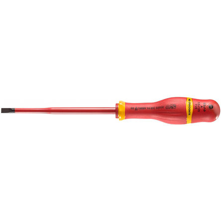 This is Slotted Insulated Screwdriver 5.5 mm Tip 125 mm VDE/1000V Approved manufactured by Facom. The manufacturer part number is AT5.5X125TVE. The built-in exquisite tip is a flat tip.