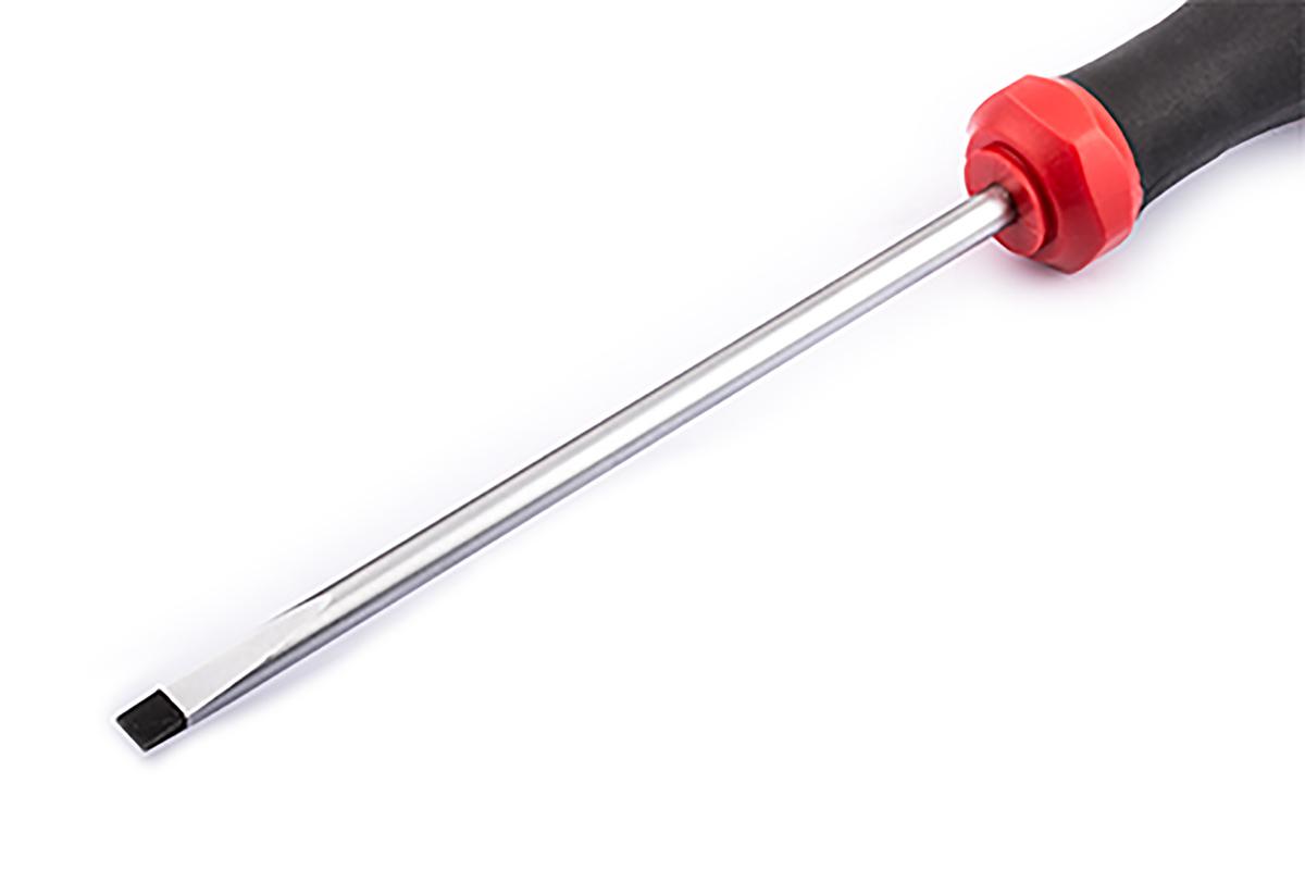 This is Slotted Screwdriver 0.4 x 2.5 mm Tip 75 mm Chrome Vanadium Molybdenum Steel manufactured by RS PRO. The manufacturer part number is 182-9658. The built-in exquisite tip is a flat tip.