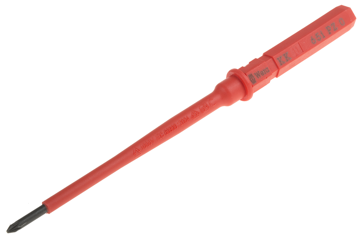 This is VDE 1000V Approved Pozidriv VDE Screwdriver PZ0 Tip manufactured by Wera. The manufacturer part number is 003450. The built-in exquisite tip is a pozidriv tip.