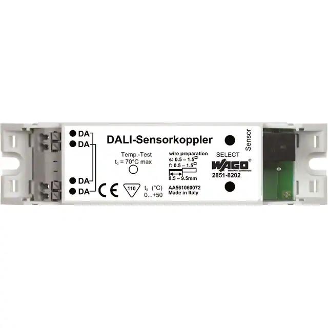 This is manufactured by WAGO Corporation. The manufacturer part number is 2851-8202. The product is rohs3 compliant. It is shipped in box. It is a type of dali sensor coupler accessory. Its typical moisture sensitivity level is not applicable. The product is suitable for use with 753-647, eco-ci kit, multi-3-ci. It has a long 12 weeks standard lead time.