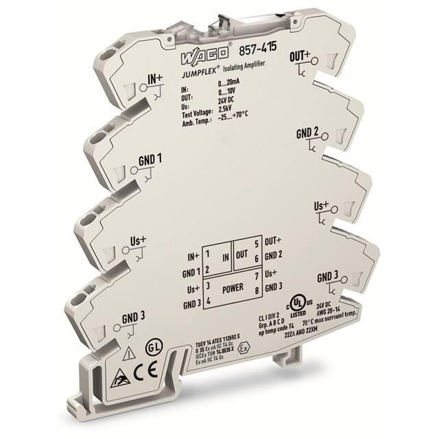 This is manufactured by WAGO Corporation. The manufacturer part number is 857-415. The product is rohs3 compliant. Moreover, it has spring terminal terminal style. The product has -25°c ~ 70°c operating temperature range. It carries current input type. It comes in isolation amplifier configuration. Furthermore, it has avoltage output. It is shipped in bag. Features a 2500v (test) isolation. Its typical moisture sensitivity level is not applicable. It has a long 12 weeks standard lead time. The product is available in din rail configuration. The product 857, is a highly preferred choice for users. It has optimum voltage supply of 24vdc.