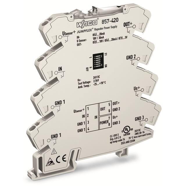 This is manufactured by WAGO Corporation. The manufacturer part number is 857-420. The product is rohs3 compliant. Moreover, it has spring terminal terminal style. The product has -25°c ~ 70°c operating temperature range. It carries current input type. It comes in isolation amplifier configuration. Furthermore, it has acurrent, voltage output. It is shipped in bag. Features a 2500v (test) isolation. Its typical moisture sensitivity level is not applicable. It has a long 12 weeks standard lead time. The product is available in din rail configuration. The product 857, is a highly preferred choice for users. It has optimum voltage supply of 24vdc.