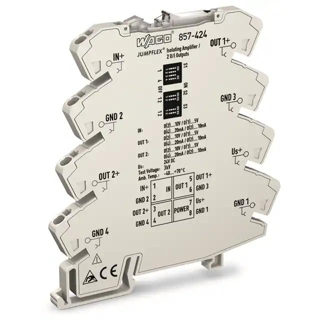 This is manufactured by WAGO Corporation. The manufacturer part number is 857-424. The product is rohs3 compliant. Moreover, it has spring terminal terminal style. The product has -40°c ~ 70°c operating temperature range. It carries current, voltage input type. It comes in isolation amplifier configuration. Furthermore, it has acurrent, voltage output. It is shipped in bag. Features a 3000v (test) isolation. Its typical moisture sensitivity level is not applicable. It has a long 12 weeks standard lead time. The product is available in din rail configuration. The product 857, is a highly preferred choice for users. It has optimum voltage supply of 24vdc.