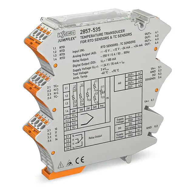This is manufactured by WAGO Corporation. The manufacturer part number is 2857-535. The product is rohs3 compliant. Moreover, it has spring terminal terminal style. The product has -40°c ~ 70°c operating temperature range. It carries resistance, temperature input type. It comes in signal conditioner configuration. Furthermore, it has acurrent, voltage output. It is shipped in bag. Features a 3000v (test) isolation. Its typical moisture sensitivity level is not applicable. It has a long 12 weeks standard lead time. The product is available in din rail configuration. The product 2857, is a highly preferred choice for users. It has optimum voltage supply of 24vdc.