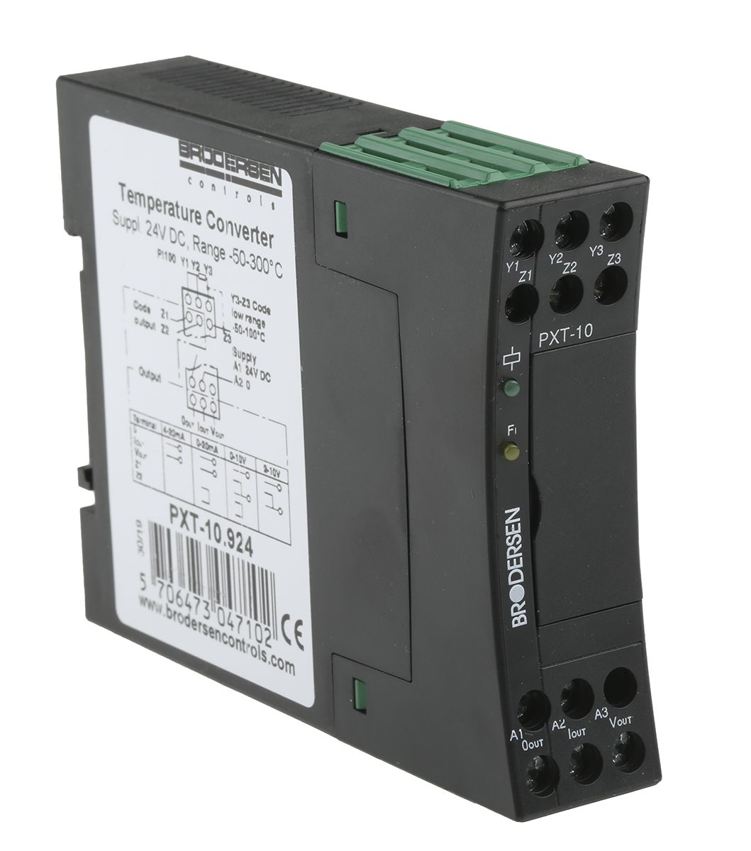 This is Temperature to Analogue Signal Conditioner -50 → 300 °C Input manufactured by Brodersen Controls. The manufacturer part number is PXT-10.924/RS. The product is available in din rail mount configuration. The product 9200, is a highly preferred choice for users. Typical input range of -50 → 300°c. Whereas, the minimum operating temperature of the product is -20°c. It has a maximum operating temperature of +55°c.