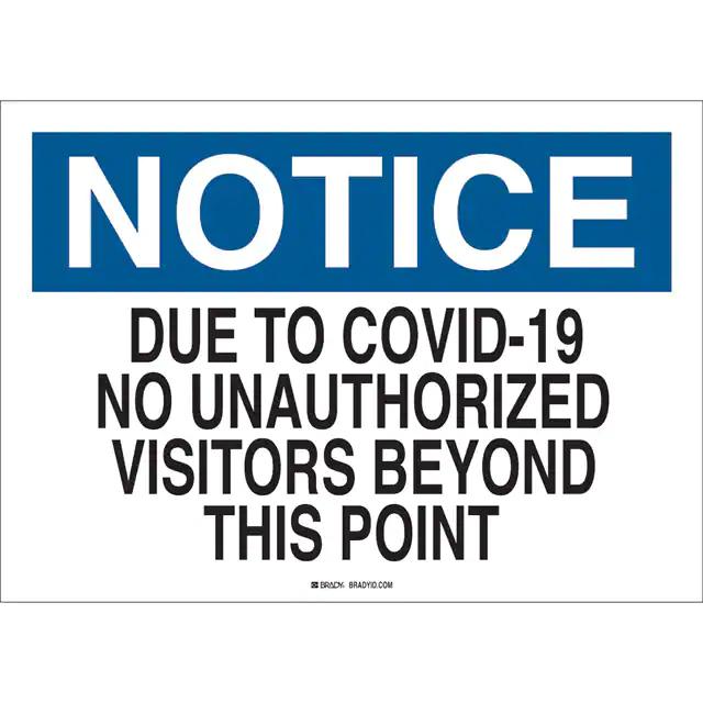 This is manufactured by Brady Corporation. The manufacturer part number is 170269. Label with a size of 10.00" l x 7.00" w (254.0mm x 177.8mm). The product is not applicable. It is assigned with possible HTSUS value of 8310.00.0000. It is shipped in bulk. It has a classic black legend, white background colour. The product b-555, is a highly preferred choice for users. The product is made from highly stable and reliable aluminum. Its typical moisture sensitivity level is not applicable. A bespoke label is a notice. due to covid-19, no authorized visitors beyond this point. label. The product is suitable for use with notice. The product is designated with the ear99 code number