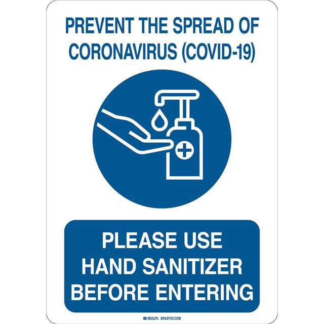 This is manufactured by Brady Corporation. The manufacturer part number is 170169. Label with a size of 10.00" l x 14.00" w (254.0mm x 355.6mm). The product is rohs compliant. It is assigned with possible HTSUS value of 3926.90.9985. It is shipped in bulk. It has a classic blue legend, white background colour. The product b-401, is a highly preferred choice for users. The product is made from highly stable and reliable plastic. Its typical moisture sensitivity level is not applicable. A bespoke label is a prevent the spread of coronavirus (covid-19). please use hand sanitizer before entering. label. The product is suitable for use with notice. The product is designated with the ear99 code number