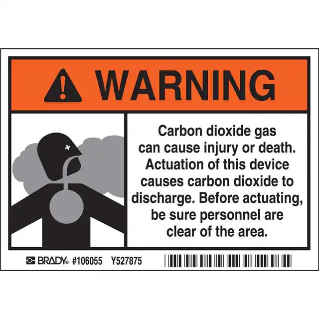 This is manufactured by Brady Corporation. The manufacturer part number is 106055. Label with a size of 5.00" l x 3.50" w (127.0mm x 88.9mm). The product is not applicable. It is assigned with possible HTSUS value of 3926.90.9985. It is shipped in bulk. It has a classic black, gray and orange legend, white background colour. The product brady®, is a highly preferred choice for users. The product is made from highly stable and reliable polyester. In addition, it is reach unaffected. Its typical moisture sensitivity level is not applicable. A bespoke label is a warning. carbon dioxide gas can cause injury or death. actuation of this device causes carbon dioxide to discharge. before act… label. The product is suitable for use with warning. It has a long 4 weeks standard lead time. The product is designated with the ear99 code number