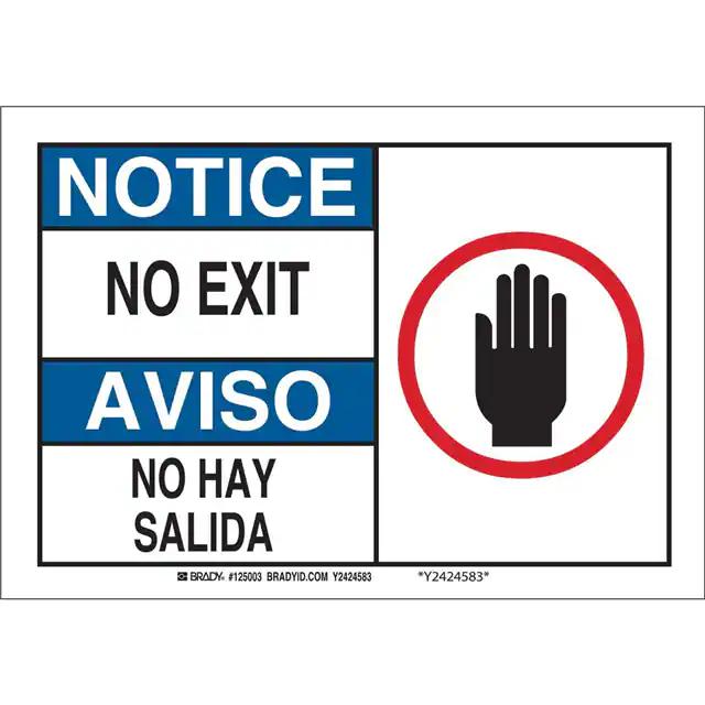 This is manufactured by Brady Corporation. The manufacturer part number is 125006. Label with a size of 14.00" l x 10.00" w (355.6mm x 254.0mm). The product is rohs3 compliant. It is assigned with possible HTSUS value of 3926.90.9985. It is shipped in bulk. It has a classic black, blue and red legend, white background colour. The product brady®, is a highly preferred choice for users. The product is made from highly stable and reliable polyester. In addition, it is reach unaffected. Its typical moisture sensitivity level is not applicable. A bespoke label is a notice/aviso. no exit/no hay salida label. The product is suitable for use with notice. It has a long 4 weeks standard lead time. The product is designated with the ear99 code number