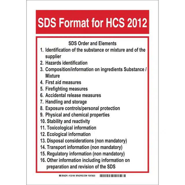 This is manufactured by Brady Corporation. The manufacturer part number is 133172. Label with a size of 14.00" l x 10.00" w (355.6mm x 254.0mm). The product is rohs3 compliant. It is assigned with possible HTSUS value of 3926.90.9985. It is shipped in bulk. It has a classic black and red legend, white background colour. The product brady®, is a highly preferred choice for users. The product is made from highly stable and reliable polyester. In addition, it is reach unaffected. Its typical moisture sensitivity level is not applicable. A bespoke label is a sds elements label. The product is designated with the ear99 code number