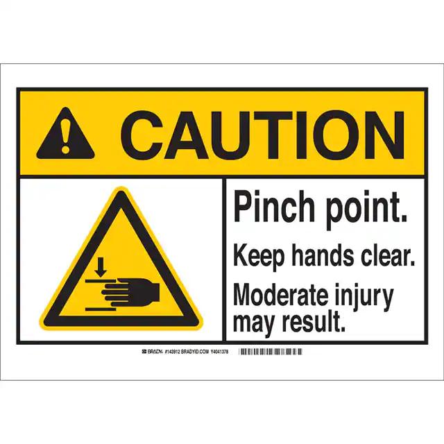 This is manufactured by Brady Corporation. The manufacturer part number is 143912. Label with a size of 5.00" l x 3.50" w (127.0mm x 88.9mm). The product is rohs3 compliant. It is assigned with possible HTSUS value of 3926.90.9985. It is shipped in bulk. It has a classic black, red and yellow legend, white background colour. The product brady®, is a highly preferred choice for users. The product is made from highly stable and reliable polyester. In addition, it is reach unaffected. Its typical moisture sensitivity level is not applicable. A bespoke label is a caution. pinch point keep hands clear moderate injury could result label. It has a long 4 weeks standard lead time. The product is designated with the ear99 code number