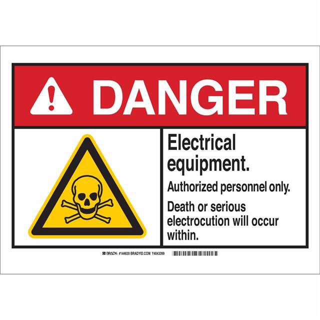 This is manufactured by Brady Corporation. The manufacturer part number is 144621. Label with a size of 5.00" l x 3.50" w (127.0mm x 88.9mm). The product is rohs3 compliant. It is assigned with possible HTSUS value of 3926.90.9985. It is shipped in bulk. It has a classic black, red and yellow legend, white background colour. The product brady®, is a highly preferred choice for users. The product is made from highly stable and reliable polyester. In addition, it is reach unaffected. Its typical moisture sensitivity level is not applicable. A bespoke label is a danger. electrical equipment authorized personnel only death or serious electrocution will occur within label. The product is suitable for use with danger. It has a long 4 weeks standard lead time. The product is designated with the ear99 code number