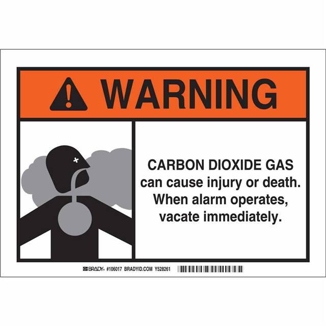 This is manufactured by Brady Corporation. The manufacturer part number is 106017. Label with a size of 10.00" l x 7.00" w (254.0mm x 177.8mm). The product is rohs3 compliant. It is assigned with possible HTSUS value of 3926.90.9985. It is shipped in bulk. It has a classic black, gray and orange legend, white background colour. The product brady®, is a highly preferred choice for users. The product is made from highly stable and reliable polyester. In addition, it is reach unaffected. Its typical moisture sensitivity level is not applicable. A bespoke label is a warning. carbon dioxide gas can cause injury or death. when alarm operates, vacate immediately label. The product is suitable for use with warning. It has a long 4 weeks standard lead time. The product is designated with the ear99 code number