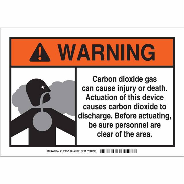 This is manufactured by Brady Corporation. The manufacturer part number is 106057. Label with a size of 10.00" l x 7.00" w (254.0mm x 177.8mm). The product is rohs3 compliant. It is assigned with possible HTSUS value of 3926.90.9985. It is shipped in bulk. It has a classic black, gray and orange legend, white background colour. The product brady®, is a highly preferred choice for users. The product is made from highly stable and reliable polyester. In addition, it is reach unaffected. Its typical moisture sensitivity level is not applicable. A bespoke label is a warning. carbon dioxide gas can cause injury or death. actuation of this device causes carbon dioxide to discharge. before act… label. The product is suitable for use with warning. It has a long 4 weeks standard lead time. The product is designated with the ear99 code number