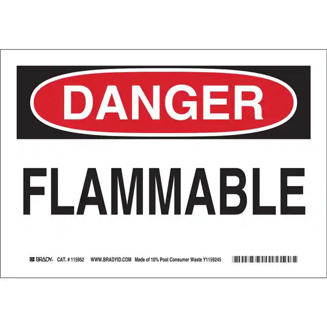 This is manufactured by Brady Corporation. The manufacturer part number is 115952. Label with a size of 10.00" l x 7.00" w (254.0mm x 177.8mm). The product is not applicable. It is assigned with possible HTSUS value of 4911.99.8000. It is shipped in bulk. It has a classic black and red legend, white background colour. The product brady®, is a highly preferred choice for users. The product is made from highly stable and reliable paper. In addition, it is reach unaffected. Its typical moisture sensitivity level is not applicable. A bespoke label is a danger. flammable label. The product is suitable for use with fire. It has a long 4 weeks standard lead time. The product is designated with the ear99 code number