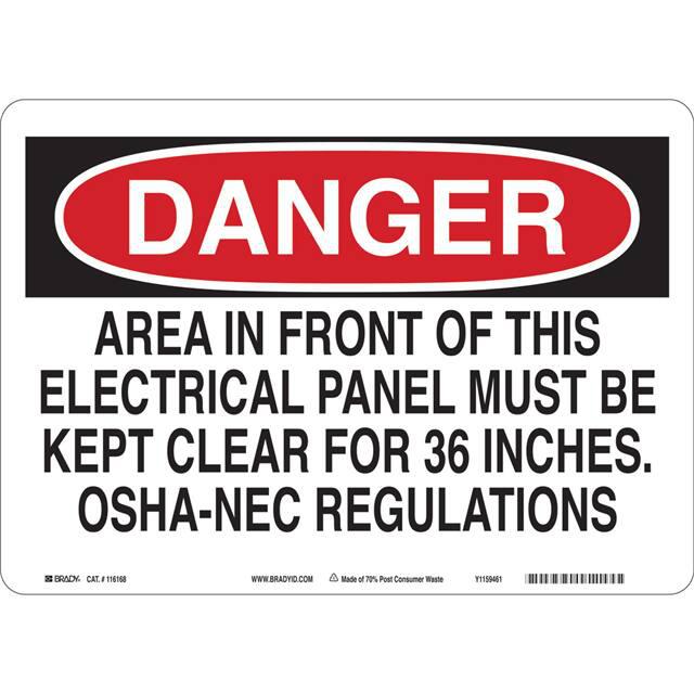 This is manufactured by Brady Corporation. The manufacturer part number is 116168. Label with a size of 14.00" l x 10.00" w (355.6mm x 254.0mm). The product is not applicable. It is assigned with possible HTSUS value of 3926.90.9985. It is shipped in bulk. It has a classic black and red legend, white background colour. The product brady®, is a highly preferred choice for users. The product is made from highly stable and reliable polypropylene. In addition, it is reach unaffected. Its typical moisture sensitivity level is not applicable. A bespoke label is a area in front of this electrical panel must be kept clear for 36 inches label. The product is suitable for use with warning. It has a long 4 weeks standard lead time. The product is designated with the ear99 code number