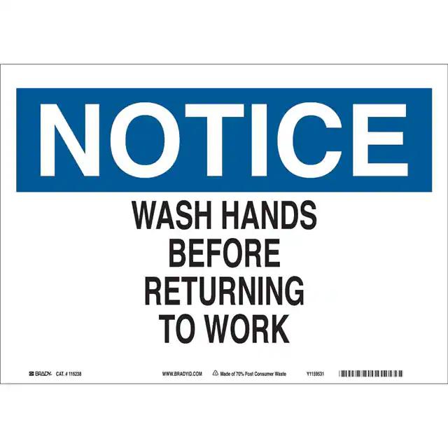 This is manufactured by Brady Corporation. The manufacturer part number is 118295. Label with a size of 14.00" l x 10.00" w (355.6mm x 254.0mm). The product is not applicable. It is assigned with possible HTSUS value of 3926.90.9985. It is shipped in bulk. It has a classic black and blue legend, white background colour. The product brady®, is a highly preferred choice for users. The product is made from highly stable and reliable plastic. In addition, it is reach unaffected. Its typical moisture sensitivity level is not applicable. A bespoke label is a notice. wash hands before returning to work label. It has a long 4 weeks standard lead time. The product is designated with the ear99 code number